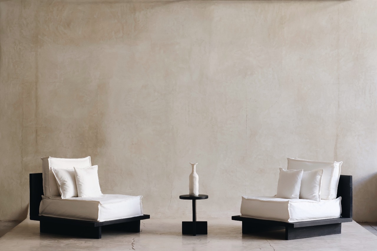 Ce fauteuil se distingue par son design minimaliste et son alliance raffinée entre bois massif brûlé et coussinerie textile généreuse. La structure noire, obtenue grâce à la technique du bois brûlé, révèle une texture profonde et un caractère brut, qui contraste avec les coussins d’un blanc pur, aux formes amples et douces.