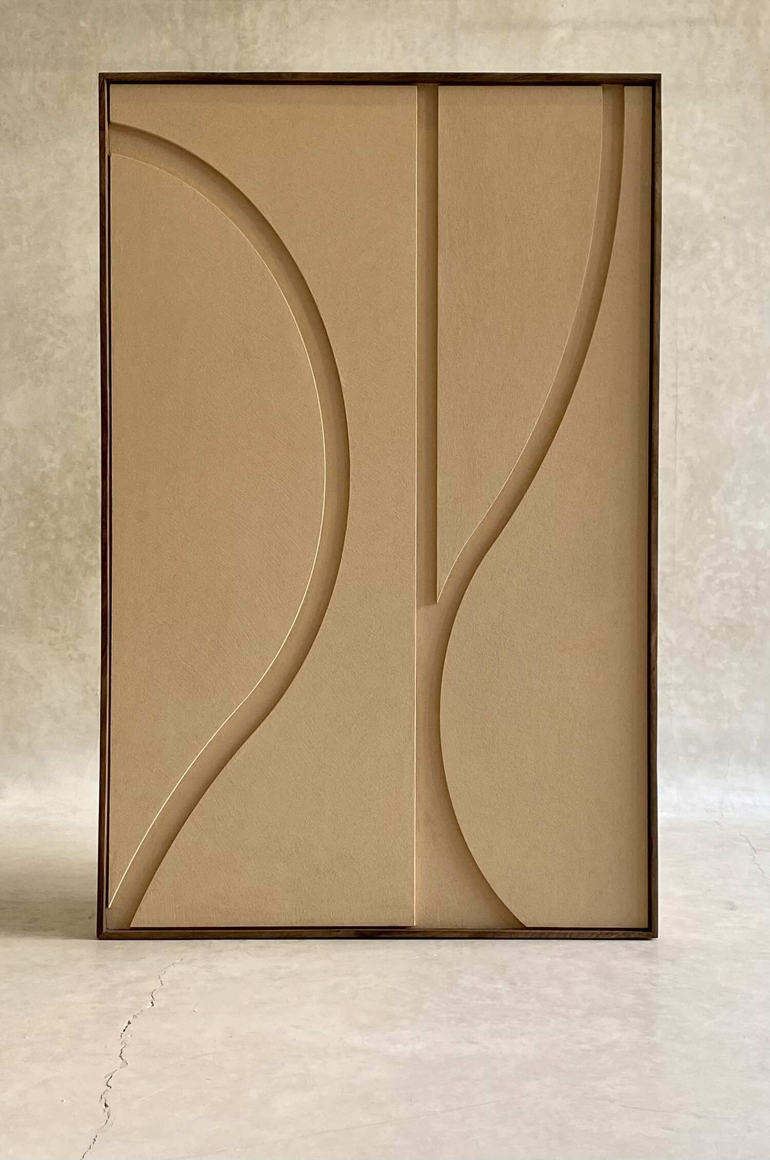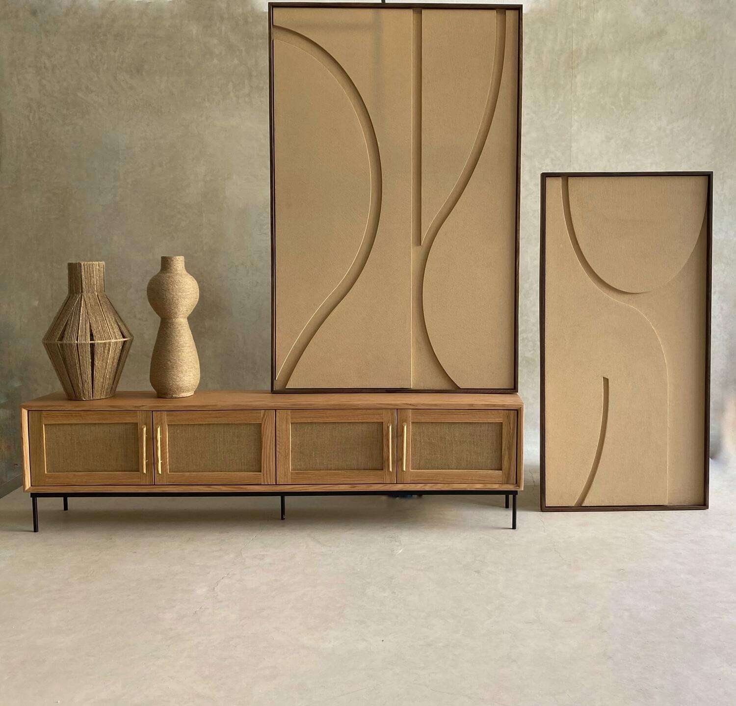 Ce tableau en bois à finition texturée se distingue par son relief subtil et ses lignes sculpturales. Les courbes et les formes géométriques s’entrelacent harmonieusement, créant une composition moderne et équilibrée. Chaque élément est minutieusement travaillé pour offrir un jeu d’ombres délicat qui apporte profondeur et élégance à la pièce. Encadré avec précision, ce tableau allie sobriété et sophistication, et s’intègre parfaitement dans un intérieur contemporain ou minimaliste.