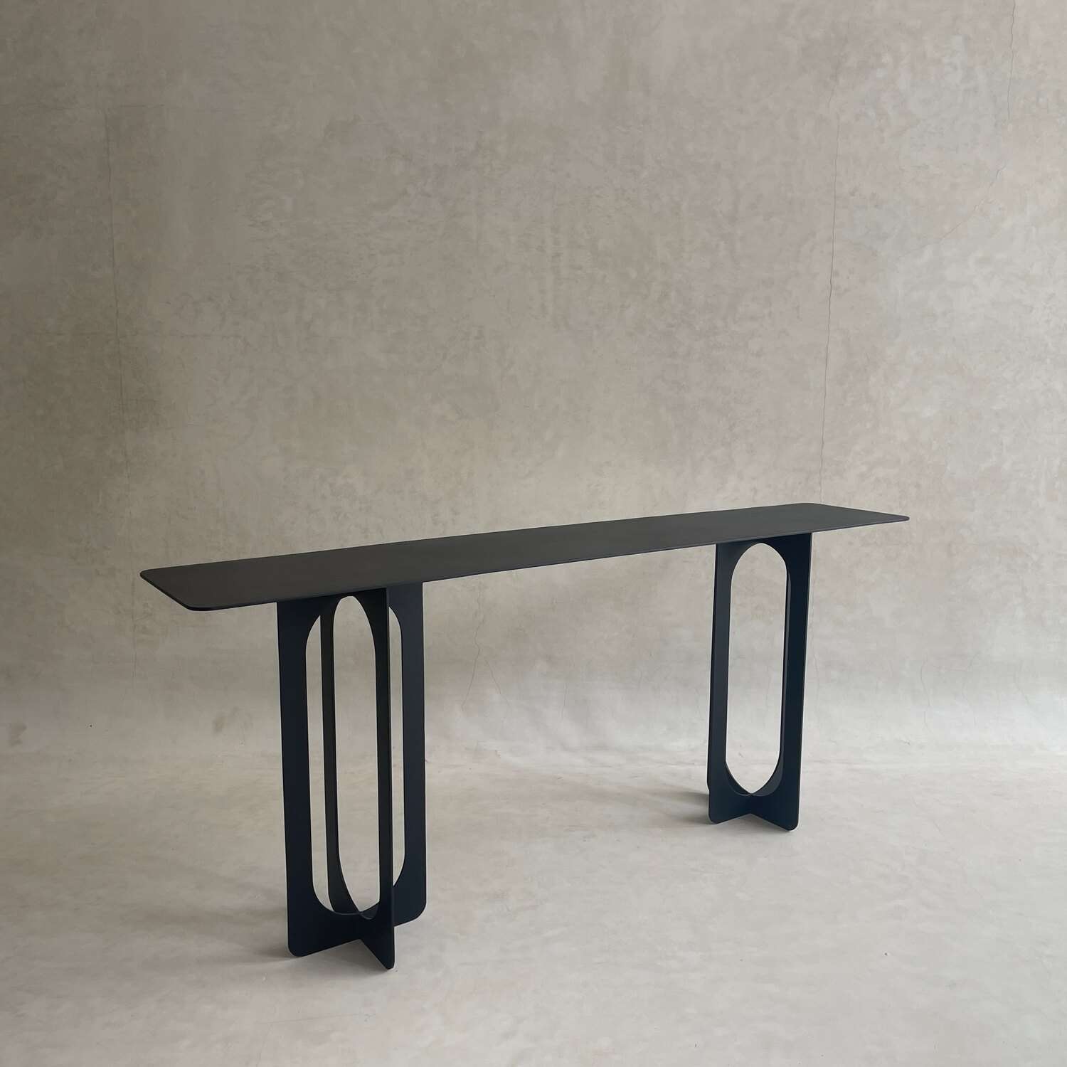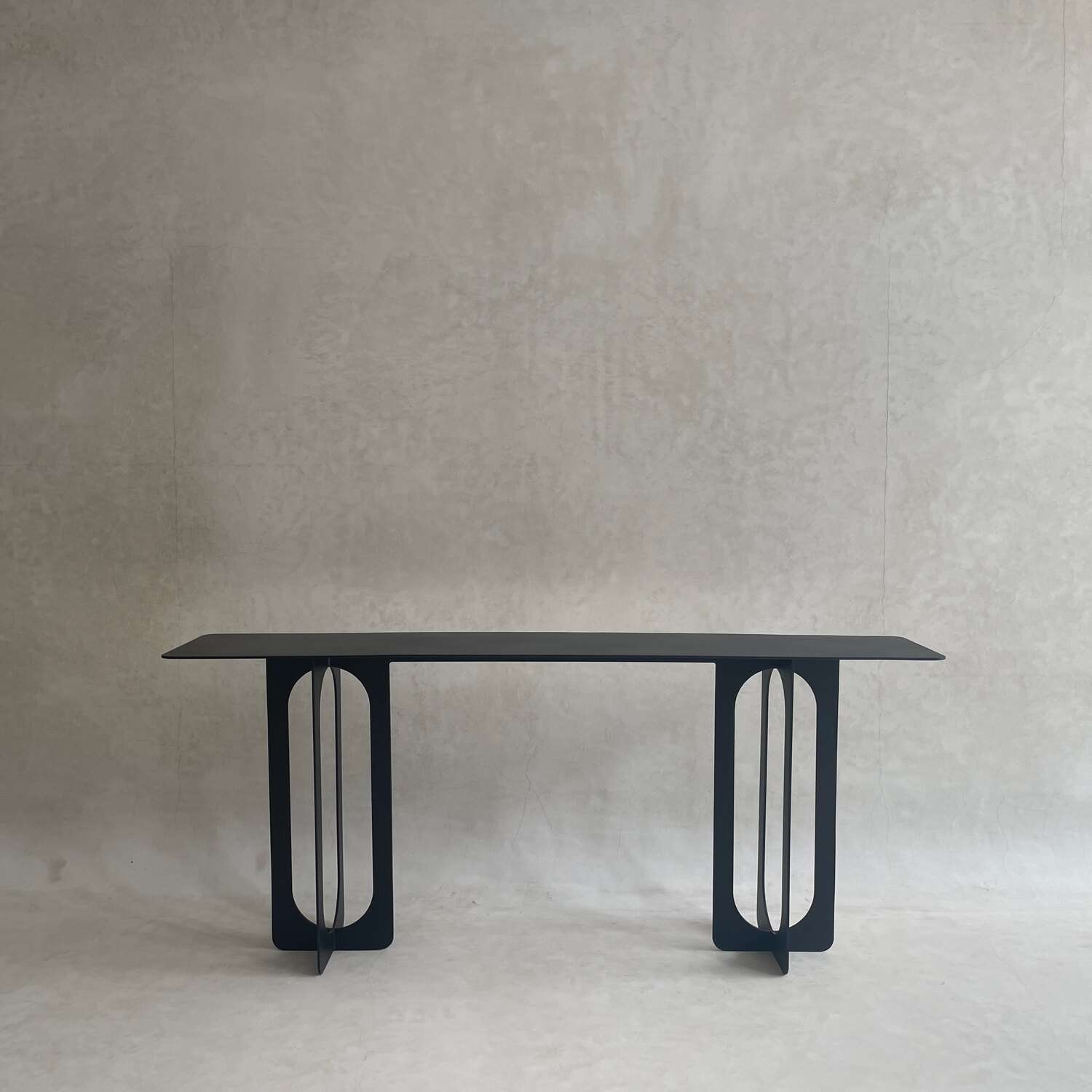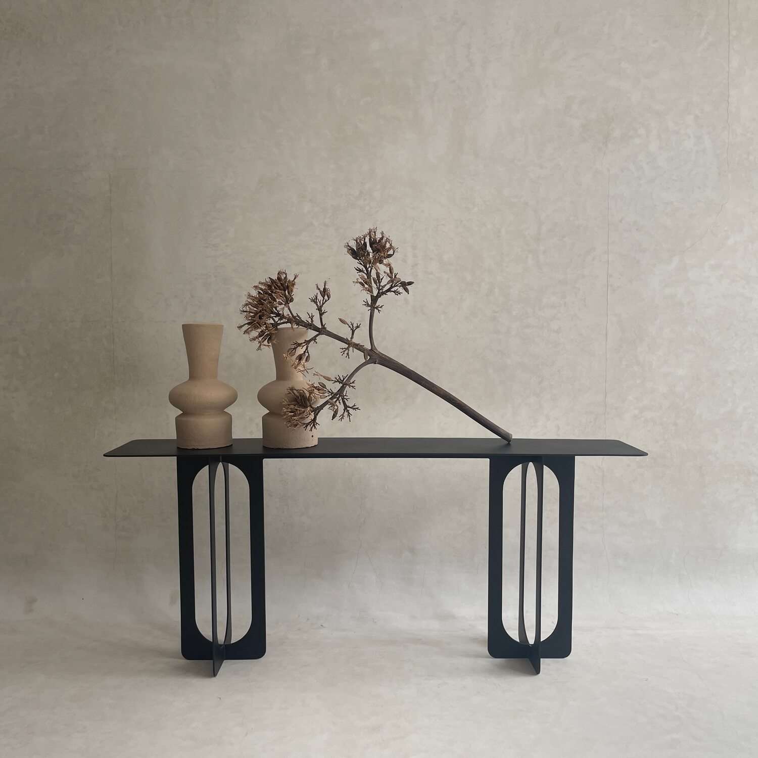 Cette console en métal thermolaqué séduit par sa silhouette contemporaine et son jeu de lignes architecturales. Son plateau fin repose sur deux pieds ajourés aux formes géométriques, offrant un équilibre subtil entre légèreté visuelle et stabilité. Avec son fini mat et durable, elle apporte une touche moderne, graphique et raffinée à tout intérieur. Parfaite pour une entrée, un espace de vie ou un décor minimaliste.