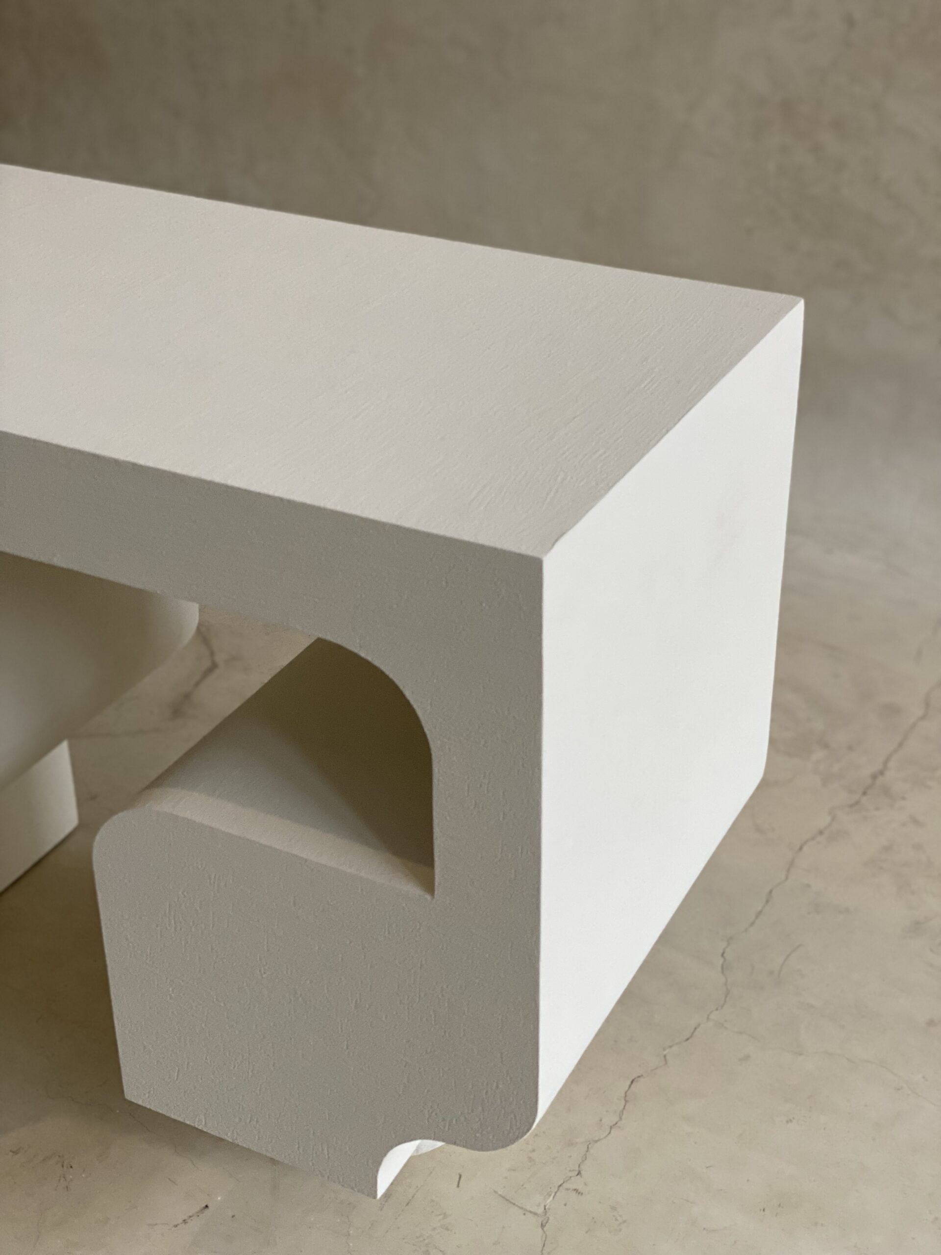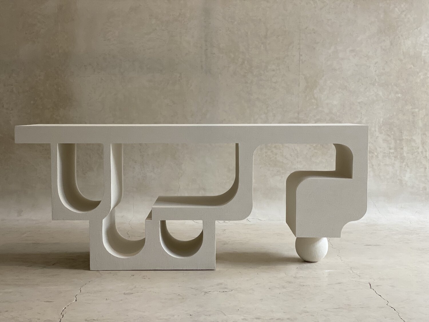 Évoquant une véritable œuvre d’art architecturale, cette console se distingue par ses formes géométriques sculptées et son équilibre visuel audacieux. Réalisée en bois avec une finition texturée rappelant la douceur d’un enduit minéral, elle combine lignes angulaires, courbes profondes et volumes évidés pour créer un jeu d’ombres saisissant.