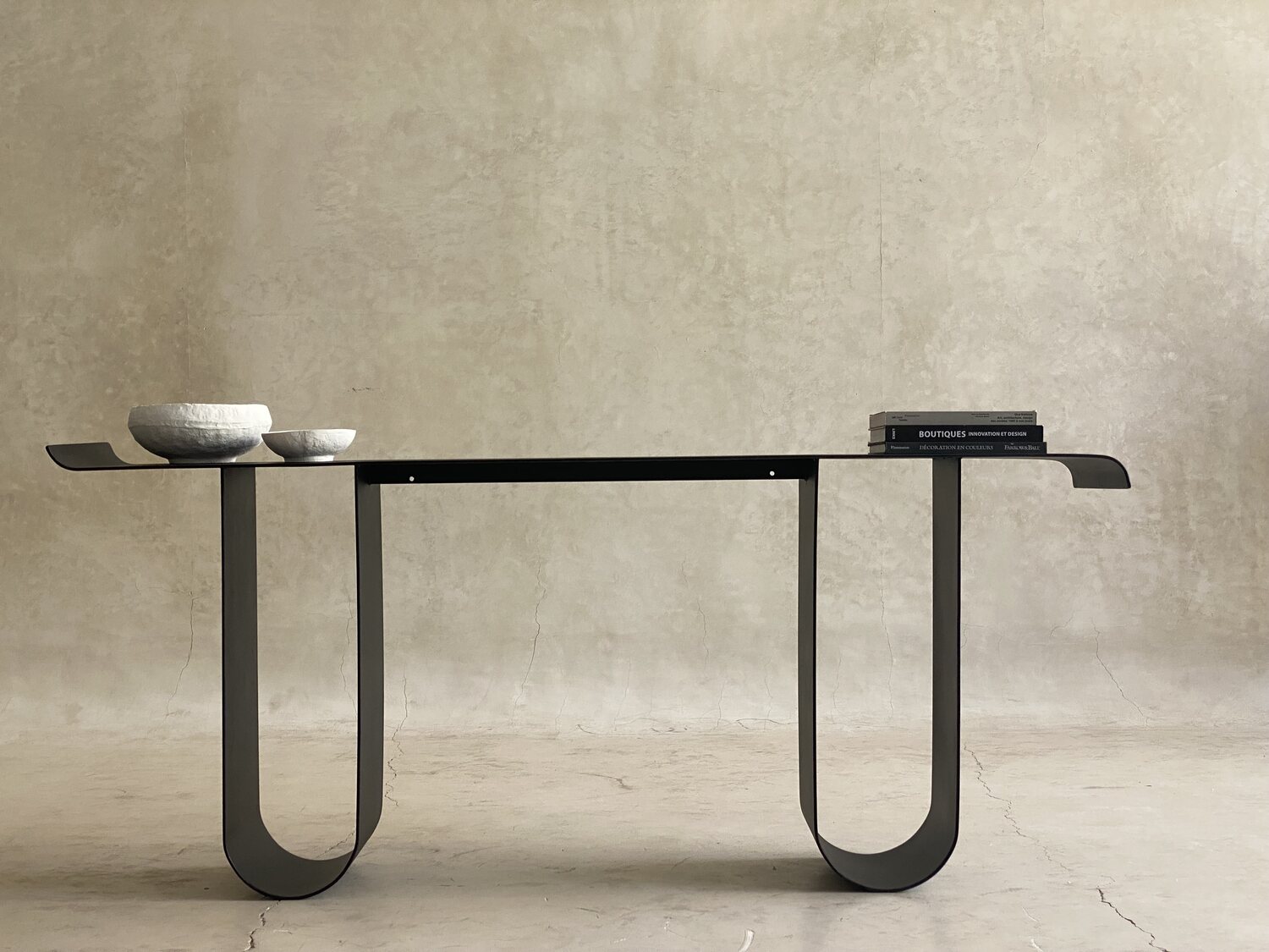 Cette console affiche un design contemporain et sculptural, entièrement réalisée en métal à la finition noire mate.