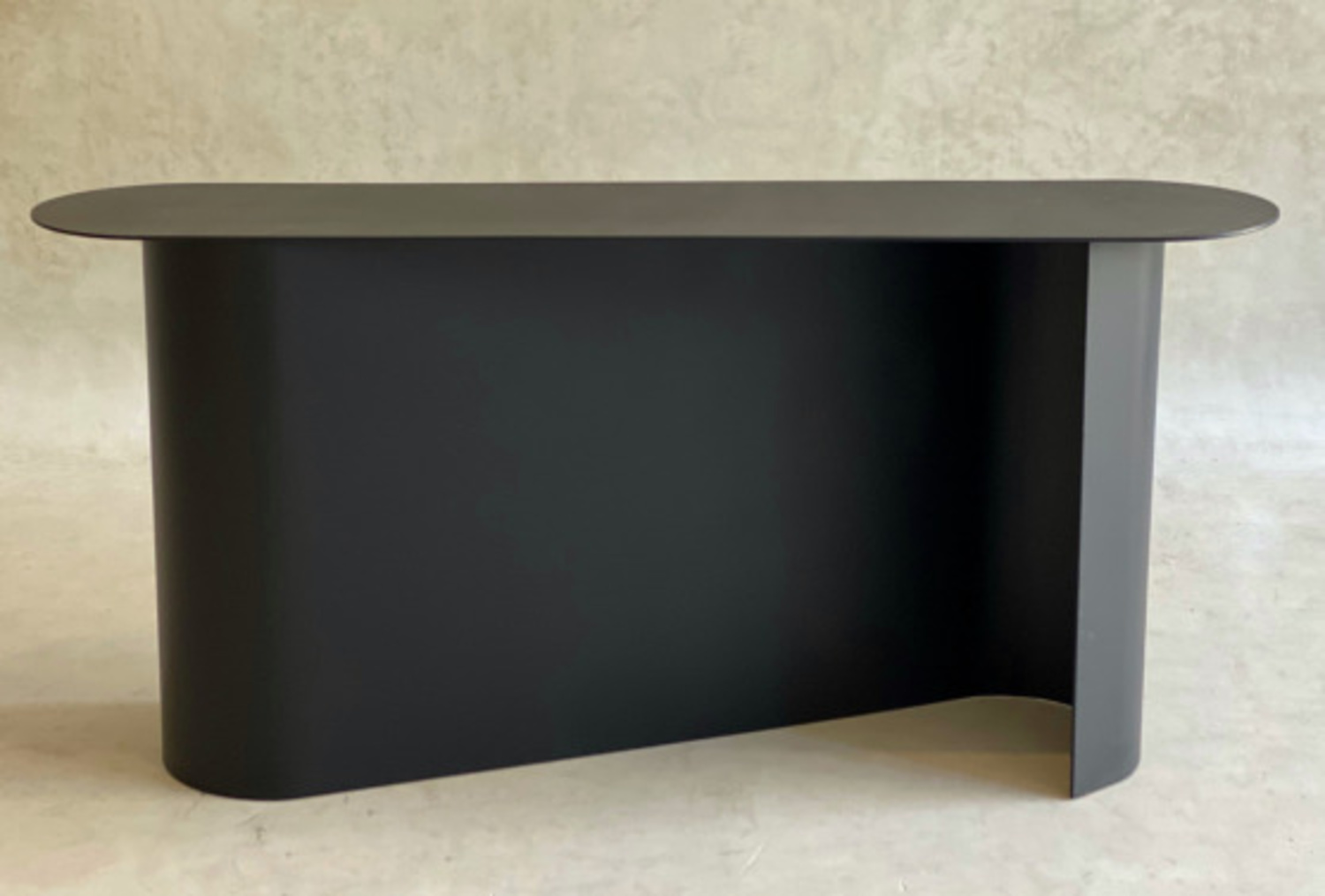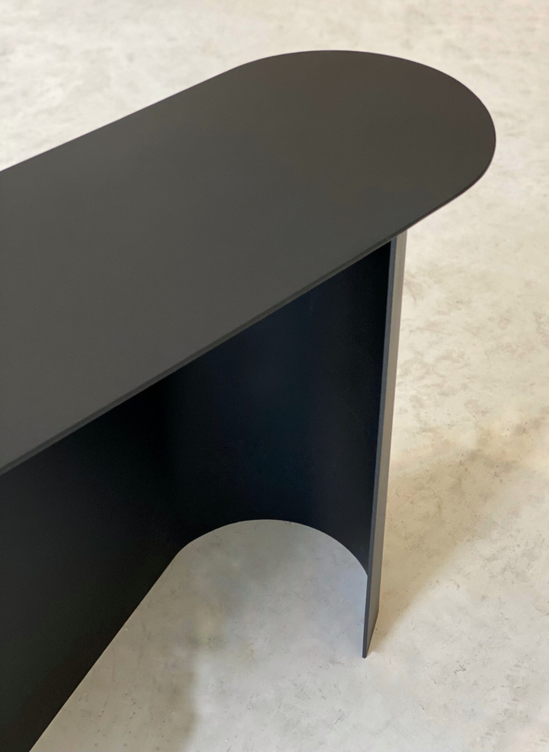 Sa forme est originale : elle combine une structure courbe et des lignes épurées. Le plateau supérieur est rectangulaire aux bords arrondis, tandis que le piétement forme un volume fermé, arrondi d’un côté et ouvert de l’autre, créant un effet sculptural.