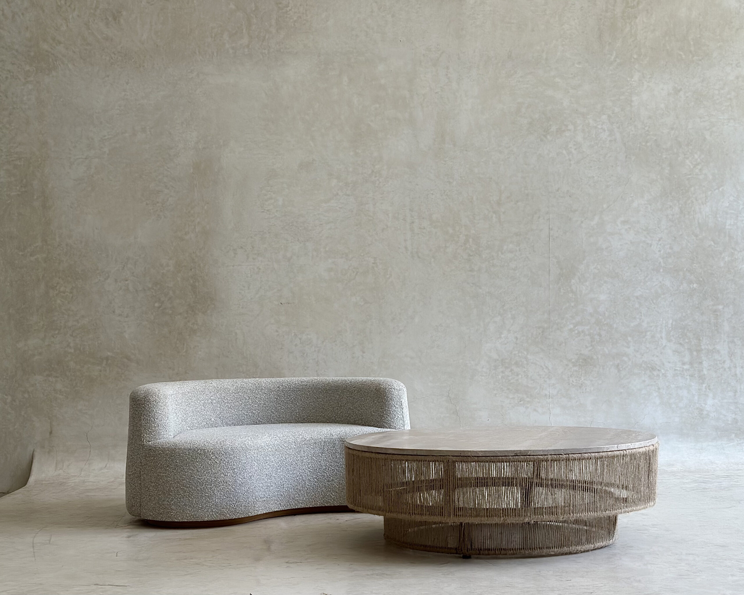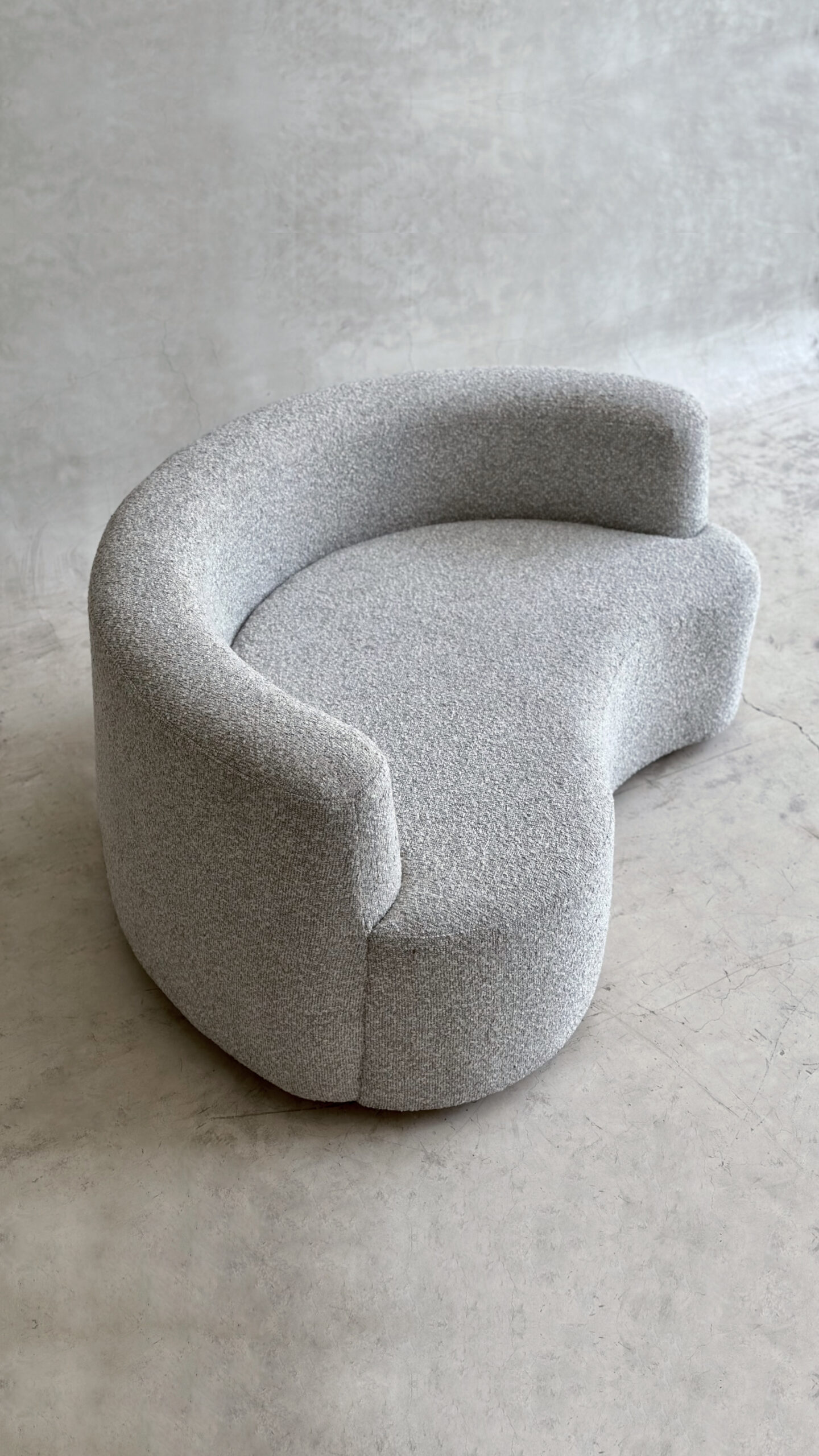 Ce fauteuil aux lignes courbes et organiques incarne l’élégance contemporaine dans sa forme la plus épurée. Sa silhouette enveloppante, entièrement revêtue d’un tissu texturé gris clair, crée une atmosphère douce et apaisante tout en offrant une assise généreuse et confortable.
