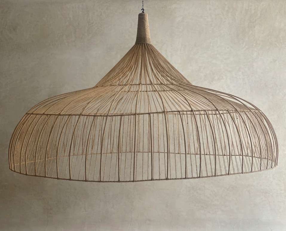 Suspension en corde tressée à la main, façonnée autour d’une structure métallique aérienne. Son large diamètre et son design artisanal apportent une élégance naturelle et une touche chaleureuse à tout espace intérieur, du salon à la salle à manger.