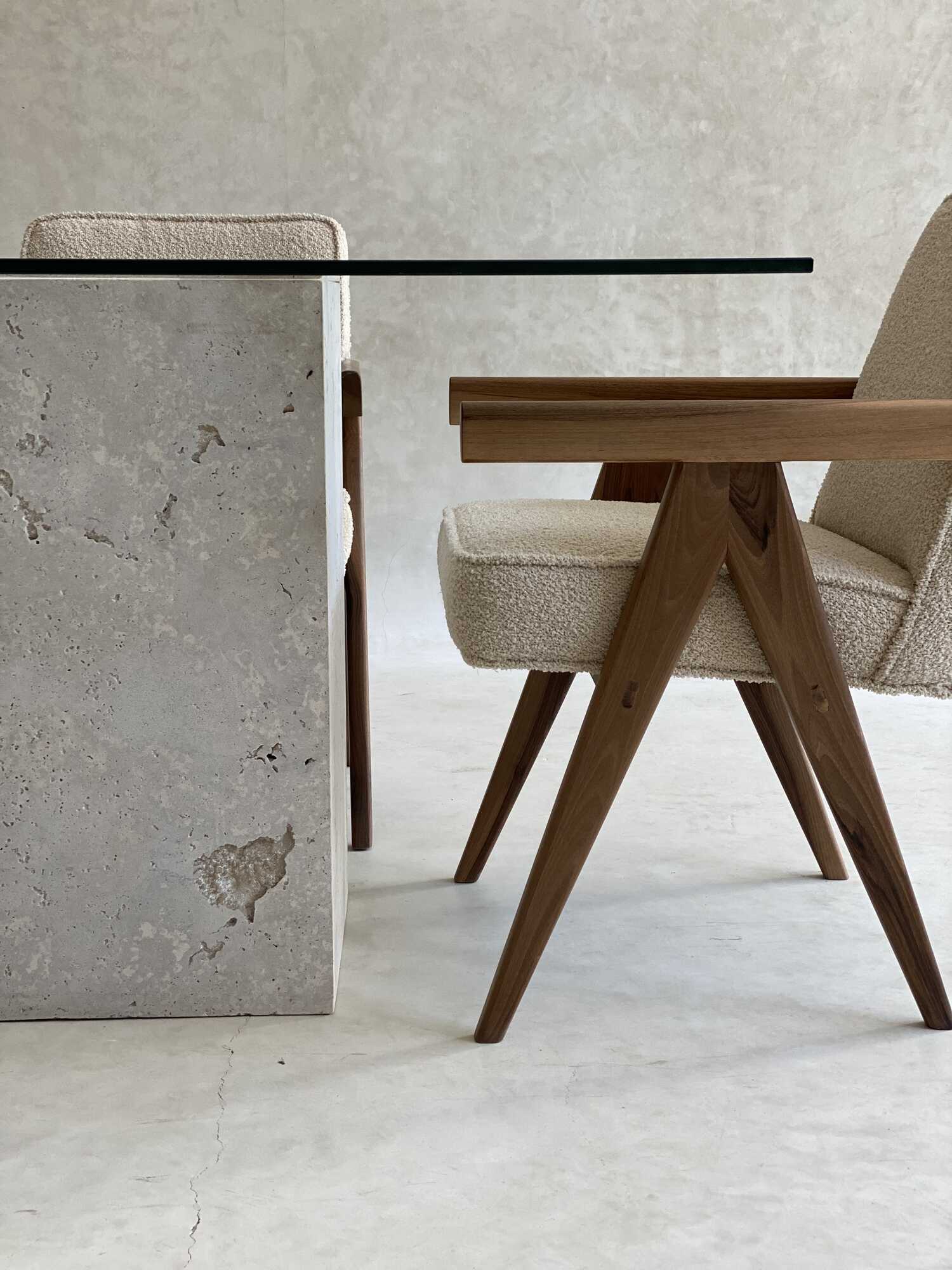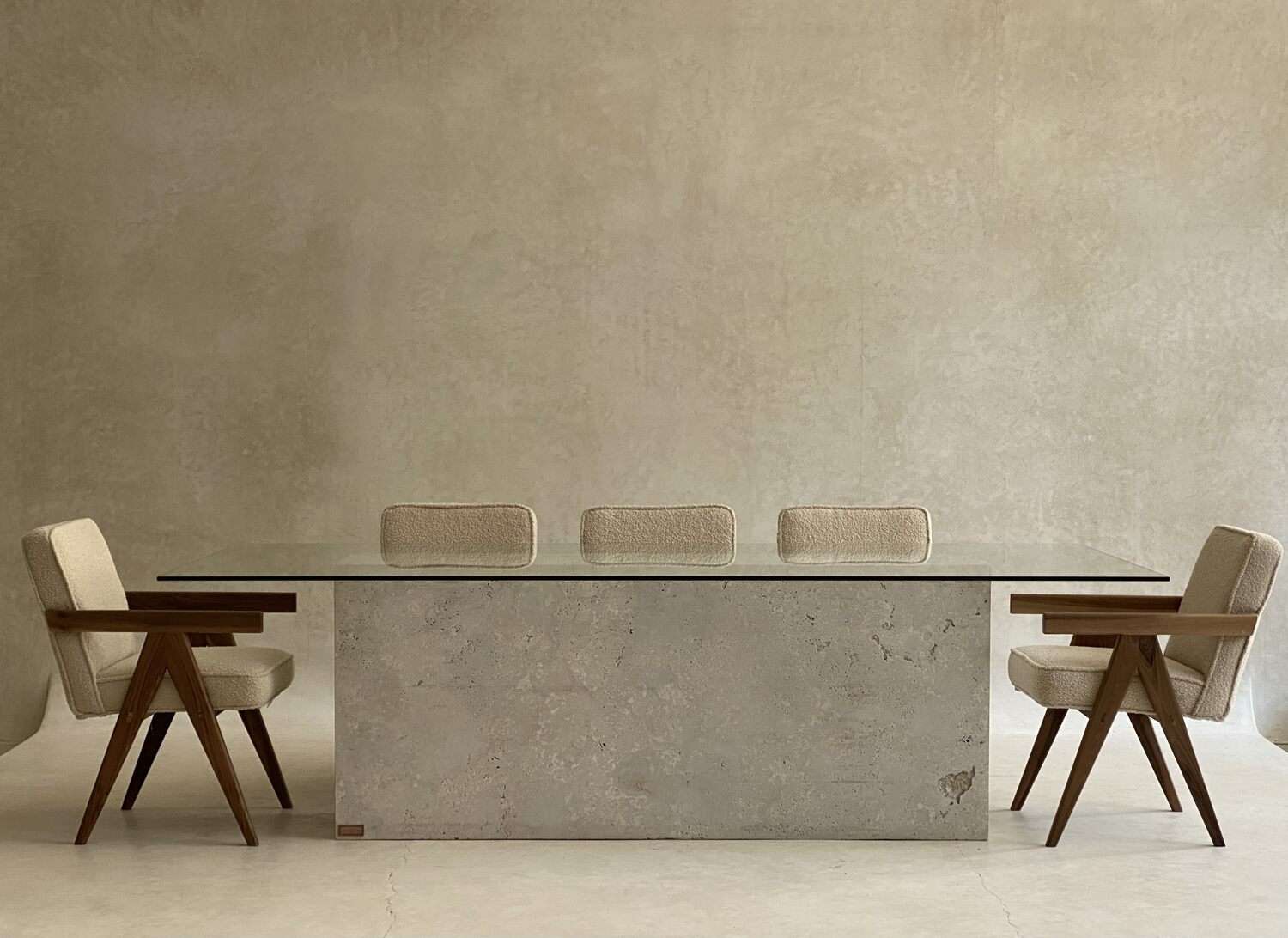 Cette table de repas associe avec finesse un piètement en travertin naturel à un plateau en verre transparent, offrant un équilibre harmonieux entre minéralité et légèreté visuelle. Le travertin révèle ses nuances authentiques et ses textures subtiles, tandis que le verre met en valeur la pureté des lignes et crée une sensation d’espace.
