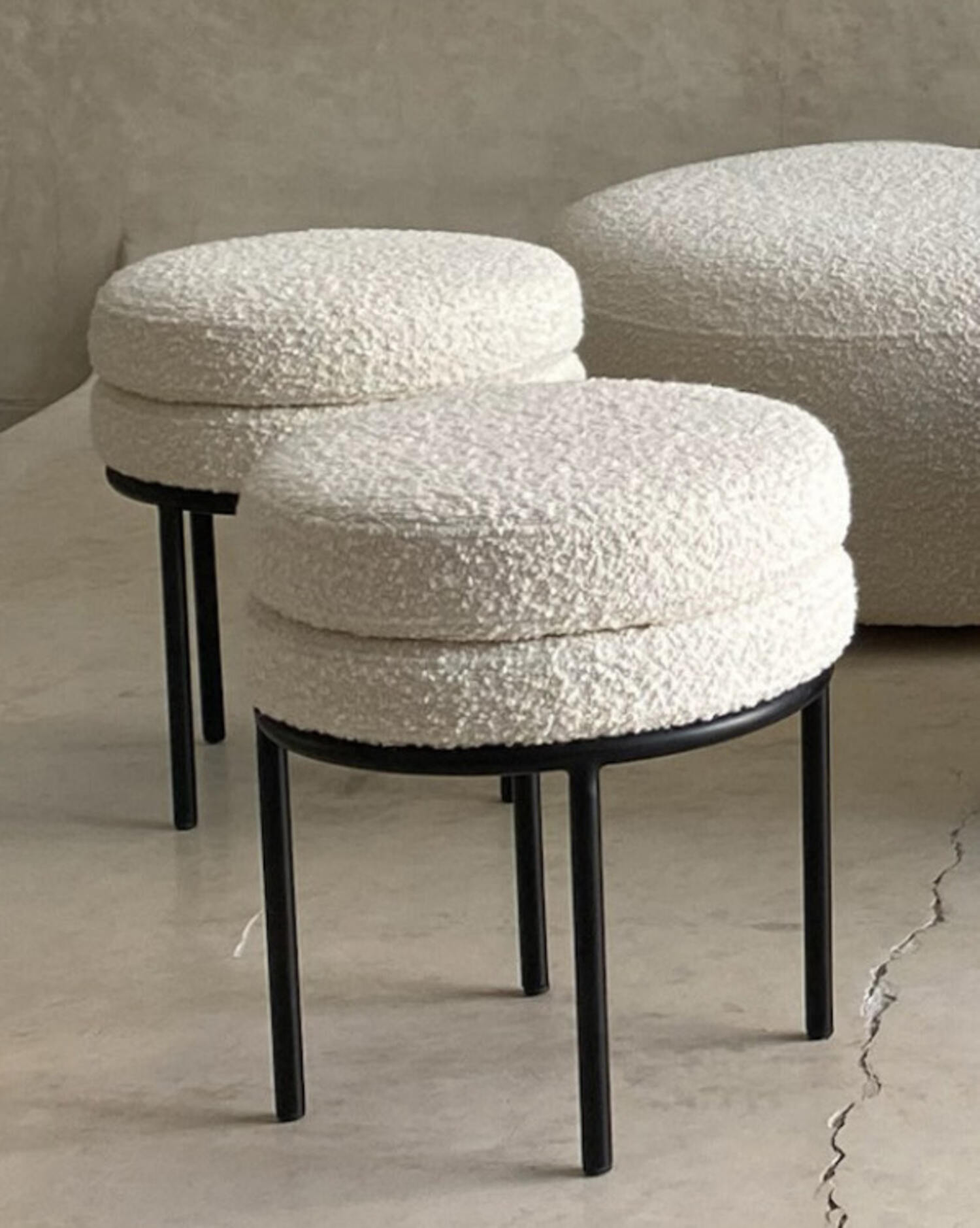 Ce tabouret au revêtement bouclé offre une assise douce et enveloppante, parfaite pour apporter chaleur et élégance à tout espace. Son piètement fin en métal noir crée un contraste moderne et épuré, permettant une intégration facile dans tous les styles d’intérieur.